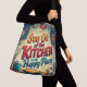 Dieses fröhliche und lebendige Design ist perfekt für Küchenliebhaber, mit dem kühnen und spielerischen Slogan "Bleibe Out of the Kitchen, It’s My Happy Place" in einem dynamischen und farbenfrohen Schriftart. Der belebte Hintergrund zeigt eine charmante Kulisse. Ein frisch gebackener Kuchen steht stolz auf einem Ofen, umgeben von köstlichen Küchenelementen wie Whisk, Holzlöffeln, einem aquamarinen Saucepan, frischen Tomaten und einer Vielzahl dekorativer Akzente. Die aquamarinen Regale oben sind mit Gläsern, Schüsseln und Geschirr bestückt, während eine adorange Orangenkatze auf einem Regal sitzt und eine Touch Verspieltheit verleiht. Früchte wie Erdbeeren, Orangen und zerstreute funkelnde Akzente schaffen ein Gefühl von Energie und Wärme und ergänzen perfekt die lebendige Typografie. Dieses Design strahlt eine gemütliche und einladende Atmosphäre aus und macht es zu einer idealen Wahl für alle, die Freude in der Küche und dem Kochen finden. Diese Tasche ist ideal, um jedem Accessoire eine Persönlichkeit hinzuzufügen. Sie ist ein Muss für Feinschmecker, Bäcker oder alle, die ihr kulinarisches Heiligtum schätzen.
