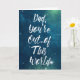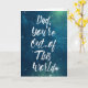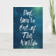 "Vater, You're Out of this World" liest die Nachricht auf dieser Karte in fett weißer Schrift gegen einen blauen und grünen Sternenhimmel im Weltraum. Mit einer koordinierenden Grafik im Inneren und einer glücklichen Vatertagsbotschaft ist es die perfekte Karte für Väter, die Liebe von Stargazing- und Sci-Fi-Filmen.