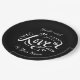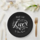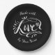 Aus Liebe schöne handgeschriebene schwarze Papier Teller. Elegantes Design mit Pinselskripttypografie. Anpassen mit benutzerdefiniertem Text. Essen für Hochzeitsfeier, Geburtstag und mehr.