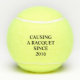 personalisierte Tennisbälle mit dem eleganten Drehbuch und dem prägen Logo-Design für Tennisschläger und Ball Icon "Causing a Racquet Since", auf der Rückseite der Tennisbälle mit eigenem, lustigem Text. Ändern Sie die Farben, alle Texte und Schriftart, um Ihr eigenes lustiges Tennisspielergeschenk zu kreieren.