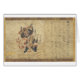 Ein des 12. Jahrhunderts japanischer Farbdruck. Die dargestellte Szene kommt von einer buddhistischen Geschichte sich bezieht über Shōki. Shoki ist eine DämonMord Gottheit von der China, die entsprechend Legende den Geruchkaiser Xuanzong (685-762) vor schlechten Dämonen schützte. Er wird mit großen Augen und einem starken Bart geschildert und eine schwarze Robe und hohen schwarzen Stiefel trägt. Hier wird er einen kleinen Dämon einschnürend gezeigt. Er trägt auch einen großen roten Hut, der fast wie es ist auf Feuer aussieht. Der Künstler hat über die berühmte Geschichte auf das links unterzeichnet oder geschrieben in, was wie Kanjicharaktere und Hiragana aussieht (das japanische Schreiben).