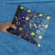 Niedliche, äußere, farbenfrohe Markerdoodles auf blauem Hintergrund. Planet, Raumsonde, Raketenschiff, Sateliten und Alien-Flugzeuge in diesem blauen Galaxiedesign. Ideal für Entpacken, Handwerk und Geschenkverpacken.