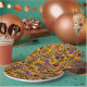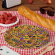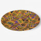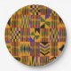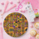 Set von acht 9" Papier-Tellern mit einem Bild eines orangen, blauen, schwarzen, lila und grünen afrikanischen geometrischen Designs. Siehe dazu Espressotasse, Tasse, quadratische Keramik, quadratische Trivette und Untersetzer. Sehen Sie sich die gesamte Sammlung This & That Plate im ZUHAUSE-Bereich an.