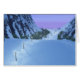 Eine 3D-Fantasielandschaft voller schillernder Schnee und zauberhafter Lichter. Eine Reihe von silbernen Glühlampen beleuchtet den Weg durch einen schneebedeckten Bergpass, der von steilen Felsklippen eingezäunt ist. Der schneebedeckte Pfad wird von dunklen Tannenbäumen eingezäunt.