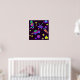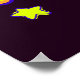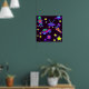 Eine niedliche Raumszene voller gelber Sterne, bunten Planeten und bezaubernden Figuren. Eine grüne Alien mit Raketenschuhen, eine Alien-Blume in einem Blumentopf, ein Retro-futuristisches Raketenauto mit einer Dame und ihrer Hauskatze, die darin reitet, und eine fliegende Untertasse mit einer fröhlichen Alien, die ihre Augen herauskitzelt. Mit MLO, der Künstlersignatur, versteckt unter den Planeten.