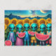 Eine Gruppe von Außerirdischen mit Wassermelone-Pose vor einem Sonnenblumenfeld