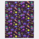 Eine niedliche Raumszene voller gelber Sterne, bunten Planeten und bezaubernden Figuren. Eine grüne Alien mit Raketenschuhen, eine Alien-Blume in einem Blumentopf, ein Retro-futuristisches Raketenauto mit einer Dame und ihrer Hauskatze, die darin reitet, und eine fliegende Untertasse mit einer fröhlichen Alien, die ihre Augen herauskitzelt. Mit MLO, der Künstlersignatur, versteckt unter den Planeten.