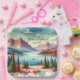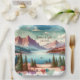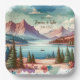 Hübsche Aquarellmauer Bergwelt Hochzeit personalisierte Teller. Die Farben sind blau, grün und braun. Fügen Sie die Namen der Braut und des Bräutigams und das Hochzeitstag in den personalisierenden Bereich ein.