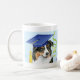 Herzlichen Glückwunsch an Ihren Lieblings-Absolvent mit einem niedlichen, glücklichen australischen Shepherd-Absolvent mit einem Mörtel inmitten eines Gefechts von Konfetti.