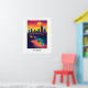 Bold and colorful poster of Austin’s skyline with a glowing sunset, downtown buildings, a river reflection, and lush trees in vivid hues.