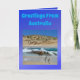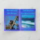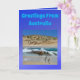 Pictured on the front are emus on emu island with a greeting from Australia text, koala on the inside, beach in the middle and Australian animals on the back