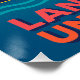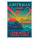 Modernes Reiseplakat im Retrostil Australiens, Trend 2025 ästhetisch. Hauptfokus: Sydney Opernhaus mit fett geometrischen Formen und hellen Neonfarben Konturen, neben der Sydney Harbour Bridge unter einem pulsierenden Sonnenaufgang. Eine spielerische Känguru-Silhouette springt über den Horizont und stilisierte Bumerangs bilden ein dynamisches Muster.