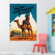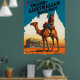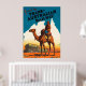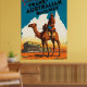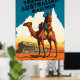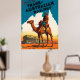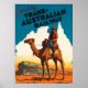 Reiseplakat der Trans Australian Railway, das Bild ist von einem australischen Soldaten, der auf einem Kamelback in den Ausläufern Australiens reitet.