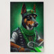 Ein wütender Freund hinter den Lenkern eines glänzenden grünen Fahrrads, das ein grünes Saint Patrick's Day Outfit trägt, das den Kopf dreht. Der Hund ist in einem festlichen Ensemble gekleidet, das mit einer grünen Bogen-Krawatte und einem passenden Oberhut versehen ist, der sich schmutzig über dem Kopf befindet. Das Outfit zeichnet sich durch die aufwändigen Entwürfe von Kleeblättern und Kobolden aus und macht deutlich, dass dieser Hund bereit ist, den St. Patrick's Day im Stil zu feiern.