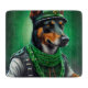 Ein wütender Freund hinter den Lenkern eines glänzenden grünen Fahrrads, das ein grünes Saint Patrick's Day Outfit trägt, das den Kopf dreht. Der Hund ist in einem festlichen Ensemble gekleidet, das mit einer grünen Bogen-Krawatte und einem passenden Oberhut versehen ist, der sich schmutzig über dem Kopf befindet. Das Outfit zeichnet sich durch die aufwändigen Entwürfe von Kleeblättern und Kobolden aus und macht deutlich, dass dieser Hund bereit ist, den St. Patrick's Day im Stil zu feiern.