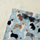 Niedliche australische Schäferhunde / Aussie Hunde in schwarzen, braunen und Merle-Mänteln sitzen und stehen auf hellblauem Hintergrund gestreute Hundeknochen und Pfotendrucke.