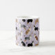 Niedliche australische Schäferhunde / Aussie Hunde in schwarzen, braunen und Merle-Mänteln sitzen und stehen verstreuten Hundeknochen und Pfotendrucken auf einem leichten lila Hintergrund.