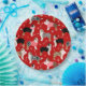 Niedlicher Valentinstag Australische Schäferhunde in schwarz, braunen Tri- und Merllmäntel mit roten, rosa und weißen Polka-Dots und Pullover mit verstreuten Pfotendrucken und Pfeil auf rotem Hintergrund.