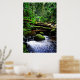 Eine lebhafte Farbaufnahme, die den berühmten Regenwald Australiens mit dem üppig grünen Unterholz darstellt, das im Hintergrund mit einem kleinen Bach in der Mitte sichtbar ist. Aus der Bucht mit moosbewachsenen Felsen und Steigungen, die den Wasserlauf wechseln