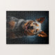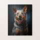 Ein nahes Porträt eines australischen Rinderhundes mit freundlichem, fröhlichem Ausdruck. Der Hund hat einen blauen Merle-Mantel mit braunen Markierungen, und seine Ohren sind aufgerissen. Es trägt einen schwarzen Kragen mit einem silbernen Etikett. Der Hintergrund ist dunkelblau mit einem subtilen, verschwommenen Muster. Die hellen Augen des Hundes und der offene Mund schaffen ein Gefühl von Freude und Verspieltheit.