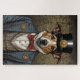 Charmanter australischer Schäferhund ist mit einem englischen Aristoteles-Anzug angezogen. Weißes Hemd und rote Fliege. Hochgeformter Hut.