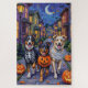 Adorable australische Schäferhunde, die in verspielten Halloweenkostümen gekleidet sind, tragen Kürbiseimer, während sie unter dem mondbeleuchteten Himmel tricksen oder behandeln. Dieses festliche Design hebt den flauschigen Mantel der Rasse, intelligente Augen und spielerische Persönlichkeit hervor, die perfekt die gespenstische und dennoch lustige Atmosphäre Halloween-Abends einfangen. Eine wunderbare Feier für Hundefreunde und Halloween-Fans gleichermaßen.