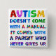 Inspirationsbotschaft von "AUTISM kommt nicht mit einem Handbuch. Es kommt mit einem Elternteil, der nie aufgibt", um stolze Autismus Eltern zu unterstützen.