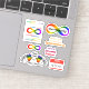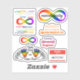 Ein Set Autismus Akzeptanzaufkleber für Autisten und ihre Familien. Die Entwürfe sind: "Autismus Akzeptanz" mit einer Unendlichkeit des Regenbogens, "Neurovielfalt", geschrieben über einem Regenbogenband, "Autismus ist keine Tragödie. Ignoranz ist", ein Single-Symbol für Regenbogenunendlichkeit, um Autismus und Neurovielfalt zu repräsentieren, "Autismus-Bewusstsein" mit Bewusstsein, durchkreuzt und ersetzt durch "Akzeptanz", "Fappy Hände sind glückliche Hände" und "Hallo, ich bin AUTISTIC" im Namensstil.