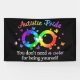 Farbenfrohe Unendlichkeit für Autistischen Stolz und die Botschaft von "Du brauchst kein Heilmittel, um dich selbst zu sein" mit wunderschönen Schmetterlingen, Herzen und Blume. Es ist ein großartiges Geschenk, den Autistischen Pride Day am 18. Juni jedes Jahres zu feiern.