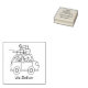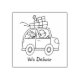 Ein bewegliches Cartoon mit einem großen Notenfahrer in einem Baseballhut, einem Hund im Rücksitz und einem Haufen Kästen und einem Kakteen auf seinem Dach.
