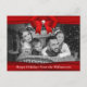 Ein modernes Foto Weihnachtskartendesign mit Ihrem Foto in Schwarz und Weiß, das das Kartengesicht füllt. Weihnachts-Rote Bänder beleuchten Ihr Foto mit einem Bogen, der mit einem Diamanten fixiert ist, und Ihrem Text. Sie können die Backside Weihnachtsgrüße, Ihre Rücksendeadresse und Ihre Namen in Skript am unteren Rand mit Platz für Sie, um eine handgeschriebene persönliche Note hinzufügen personalisieren.