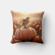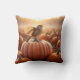Ein kleiner Vogel mit ausgebreiteten Flügeln singt auf einem großen Kürbis in einem Kürbisfeld bei Sonnenaufgang