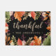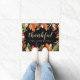 Personalisierte Begrüßungsmatte in schicken und haltbaren schwarzen Elementen "dankbar" in handgeschriebener Kalligraphie-Schrift, umgeben von farbenfrohen Herbstlauben und Ästen in reichen Herbsttönen. Personalisieren Sie mit Ihren Namen oder Familiennamen am unteren Ende für einen perfekten Weg, um Herbst-Beifall zu Ihrem Haustor in diesem Erntedank Saison.
