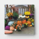 Eine schöne Ausstellung von Blume, Kürbissen und Squash in einem Garten. Sehr hübsche Herbstdekoration!