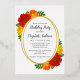 Autumn red, orange and gold florals bordering gold circle frame with eucalyptus and botanical greenery for a fall event