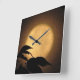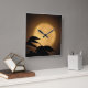 Es ist Herbst, und ein leuchtend goldgelber Vollmond ist hinter den schwarzen Silhouetten von Blätter aufgetaucht, die in der Brise auf dieser dramatischen Uhr der Kunstfotografie wehen. Der Hintergrund ist in Orange-, Gold- und Brauntönen beleuchtet, um ein abstraktes Muster in einem asiatischen Motiv zu erzeugen.