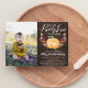 Herbst in Liebe mit diesen bezaubernden rustikalen Kindergeburtstag Party Einladungen mit einem LieblingsFoto auf der links Seite. Das Design umfasst einen orangefarbenen Kürbis, der mit bordeauxroten, rosa und orangefarbenen Blume und grünem Blattwerk auf einem Holzboden verziert ist. "Unser kleiner Kürbis dreht sich" erscheint oben in schicken Kalligraphie-Schriftzeichen mit dem Alter Ihres Kindes auf dem Kürbis. Beispiel zum ersten Geburtstag gezeigt. Personalisieren Sie Ihre Geburtstagsfeierdetails in weißer Schrift.