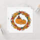 Whimsical autumn scene featuring smiling pumpkins within a vivid leaf wreath. Warm orange, yellow, and earthy greens evoke cozy fall vibes for kids, family apparel, and seasonal decor.