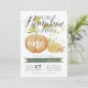 Herbst in Liebe mit diesen bezaubernden rustikalen Kindergeburtstag Party Einladungen. Das Design umfasst orangefarbene Wasserfarbenkürbis und Herbstblätter, mit "unserem kleinen Kürbis dreht sich" in schicken Schriftzeichen. Das Alter Ihres Kindes ist auf einem der Kürbis eingeschrieben und kann für jedes Alter angepasst werden. Beispiel zum ersten Geburtstag gezeigt. Personalisieren Sie sich mit Ihren Geburtstagsfeierdetails unten in reich marineblau Buchstaben.