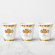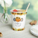 Dieses Design bietet drei reizvolle Kürbis in Orange, Schwarz und Weiß sowie Leopardendruck. Sonnenblumen und Kürbis umkreisen die Kanten der Tasse oben und unten. Der Name der werdenden Mutter in einer handgeschriebenen kursiven Typografie wird neben "Baby Shower" und dem Datum vorgestellt.