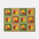 Vier Plätze sind mit Blätter und Kürbissen in den Farbtönen Rot, Orange, Gelb und Braun dekoriert. Die weiße Naht fügt eine dekorative Touch hinzu, die dem sich wiederholenden Muster das Aussehen eines Steppdecks verleiht und ein sehr gemütliches Gefühl für den Herbst schafft.
