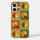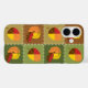 Vier Plätze sind mit Blätter und Kürbissen in den Farbtönen Rot, Orange, Gelb und Braun dekoriert. Die weiße Naht fügt eine dekorative Touch hinzu, die dem sich wiederholenden Muster das Aussehen eines Steppdecks verleiht und ein sehr gemütliches Gefühl für den Herbst schafft.