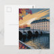 This stylized illustration captures a serene European riverside scene framed by warm autumn foliage and classic architecture. The balanced composition highlights a grand riverside building, an elegant stone bridge, and rich reflections across calm water. With a refined poster-style aesthetic, simplified shapes, and a striking seasonal color palette, this artwork delivers a timeless, atmospheric mood perfect for lovers of travel-inspired cityscapes, architecture, and fall-themed visual storytelling.