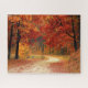 Dieses Rätsel wird durch ein Foto einer ruhigen, schmutzigen Straße, die sich zwischen dem herrlichen Herbstwald zieht, geschmückt.