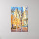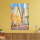Das Bild zeigt im Herbst einen Birkenhain in einer städtischen Umgebung. Die Bäume haben eine weiße Rinde mit schwarzen Markierungen und sind von gefallenen gelben Blätter umgeben. Im Hintergrund erheben sich große Gebäude mit Glasfassaden gegen einen klaren, blauen Himmel. Straßenlampen sind unter den Bäumen zu sehen, was das urbane Ambiente noch verstärkt.