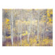 Ein Foto erfasst einen dichten Hain von Aspen-Bäumen in ihrem Herbstglanz. Die Bäume stehen hoch mit weißer Rinde und nackten Ästen, ihre Blätter sind lebhaft gelb, was einen auffallenden Kontrast zu den abgestuften Grauen und Braunen des Waldbodens schafft. Das Sonnenlicht filtert durch die Baumkronen und strahlt ein warmes Licht auf die Szene.