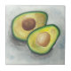 Aquarellmalerei eines frischen grünen Avocado in Scheiben geschnitten. Grauer und blauer Hintergrund.