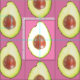 Avocado mit tropischen Früchten. Gemüsliches farbiges Design, Aquarellwirkung.