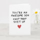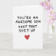 This heartfelt card delivers a message of pride and encouragement with a bold, personal touch. Centered on a bright white background, the handwritten-style text reads, “YOU’RE AN AMAZING SON KEEP IT UP,” making the message feel sincere and direct. The slightly uneven lettering adds warmth, like a note written straight from the heart. Beneath the words sits a bright red heart, drawn with lively red and white strokes that add energy and emotion. The contrast between the black lettering and the red heart makes both elements stand out clearly. This card celebrates love, support, and appreciation, making it a meaningful way to remind a son how valued and admired he is. ❤️💌