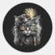 A fierce looking dark gray and black pussy cat wearing a leather hat with steampunk brass on it. A bronze feather tops the cock-eyed hat. This beautiful feline is wearing a golden or amber lensed monocle giving one eye a bronze tone, Around the cats neck hangs a brass trinket of some kind adding to the overall Steampunk attire.